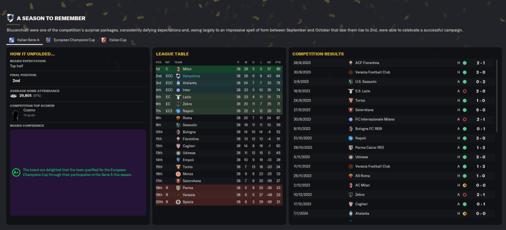First up was a trip to in-form Roma, where a switch to a more defensive approach failed drastically as Abraham and Icardi scored in the first 20 minutes. But a half-time water bottle throw and more attacking switch saw a brilliant comeback as another Cosimo brace earned a 2-2 draw. Milan beat Monza 3-1 to close the gap to one point.