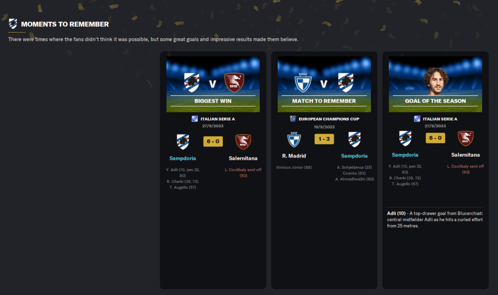 Candreva recorded the second-most assists with his 12 only bettered by Inter’s Calhanoglu (13). Candreva also finished with the best average rating in Serie A with 7.42, which won him the Serie A Best Player of the Season award. While Cosimo won Best Young Player of the Season for his 19 goals in 37 games. And Samp’s impressive defensive efforts saw Bazunu set a new Serie A record 20 clean sheets in his first season in Italy.