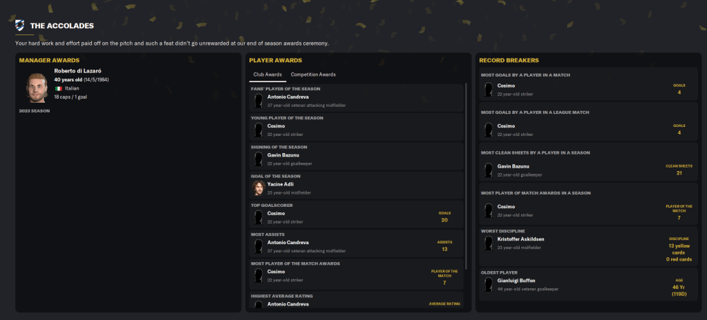 Cosimo also impressed, scoring 20 goals in all competitions and won fans’ young player of the season. While Ahmedhodzic was brilliant with five goals and a 7.28 average rating, Adli scored 12 and got six assists, Bazunu got a 7.10 average rating and left-back Tommaso Augello averaged 7.10 but was poor towards the end of the season.