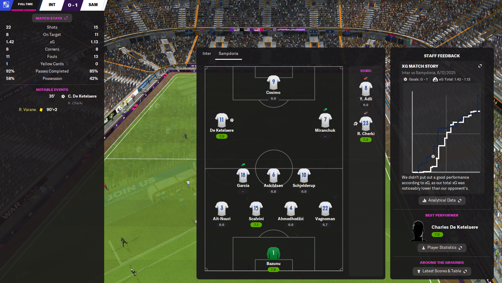 That teed up a massive second vs. top clash, with Samp leading still unbeaten Inter by one point. However, in four trips to Inter, Samp had suffered four defeats. But this season is very different as a De Ketelaere header got Samp ahead and they defended heroically to deny Inter and claim a massive 1-0 win.