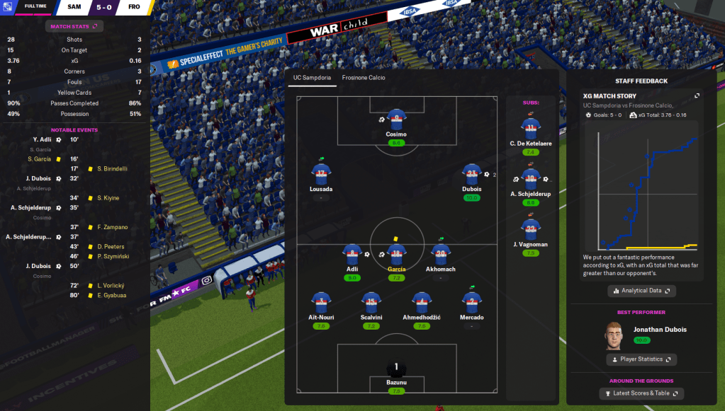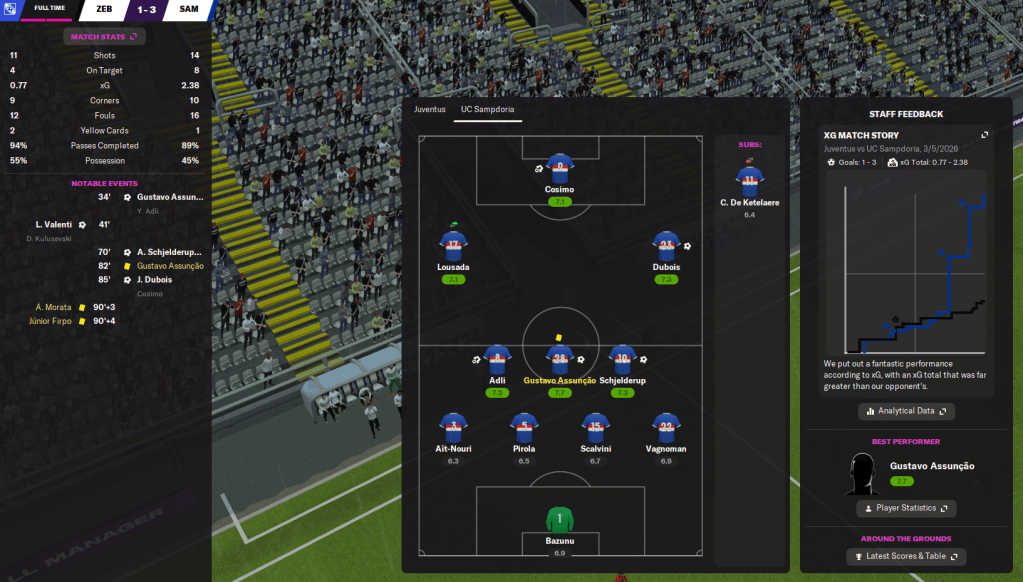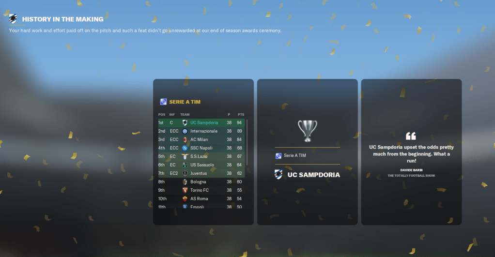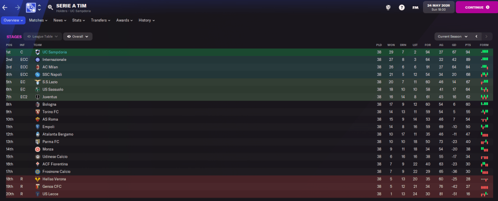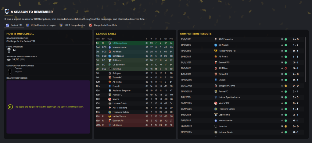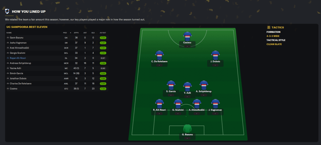 That ensured Samp finished on 94 points and won the league by five points from Inter, 10 clear of Milan and a huge 26 ahead of fourth-place Napoli! They were the top scorers in the league with a huge 94 goals and conceded 27. Dubois had the best rating in the league of 7.66 and got the second most player of the match with 7 in 16 games. Schjelderup got the most assists with 16 and a 7.59 average rating from 32 games, which broke his own Serie A full-season record.