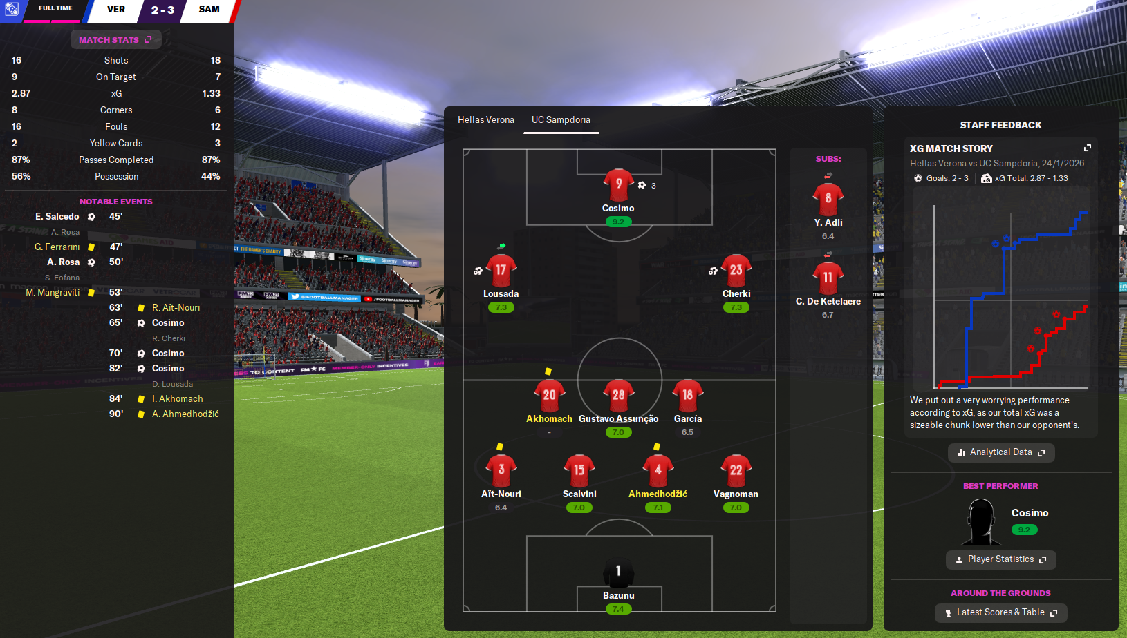 In what feels like an annual tradition the new year began at home to Atalanta – in what was the first game played in the full version of FM22. Samp came out flying as Schjelderup bagged a brace and an assist in a 5-0 rout. However, they then got battered 3-1 at Sassuolo before three goals from corners through giant winger Charles De Ketelaere, defender Anel Ahmedhozic and midfielder Simón García’s first league goal for the club earned a 3-1 win at struggling Fiorentina. A third successive away game took them to next-to-bottom Verona, who raced into a 2-0 lead. But a stunning turnaround inspired by a 17-minute Cosimo hat-trick, which ended his seven-game goalless streak, and potentially a stray water bottle at half-time saw Samp win 3-2.