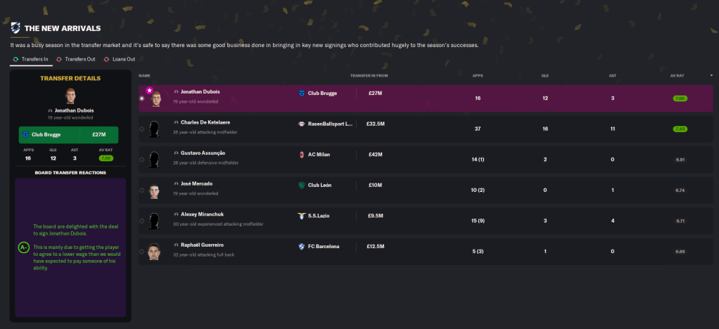 The manager was keen to have a fairly quiet January transfer window, but that was easier said than done as Europe’s finest were all after his best players. Real Madrid and Man City put in bids for star striker Cosimo Marco Da Graca, which prompted another big new contract, and the likes of Real, Atletico, Bayern and Hertha put in substandard bids for star midfielder Andreas Schjelderup. However, midfielder Kristoffer Askildsen did move to Barcelona for £15 million and the inconsistent Rayan Cherki joined Real Madrid for £33 million.