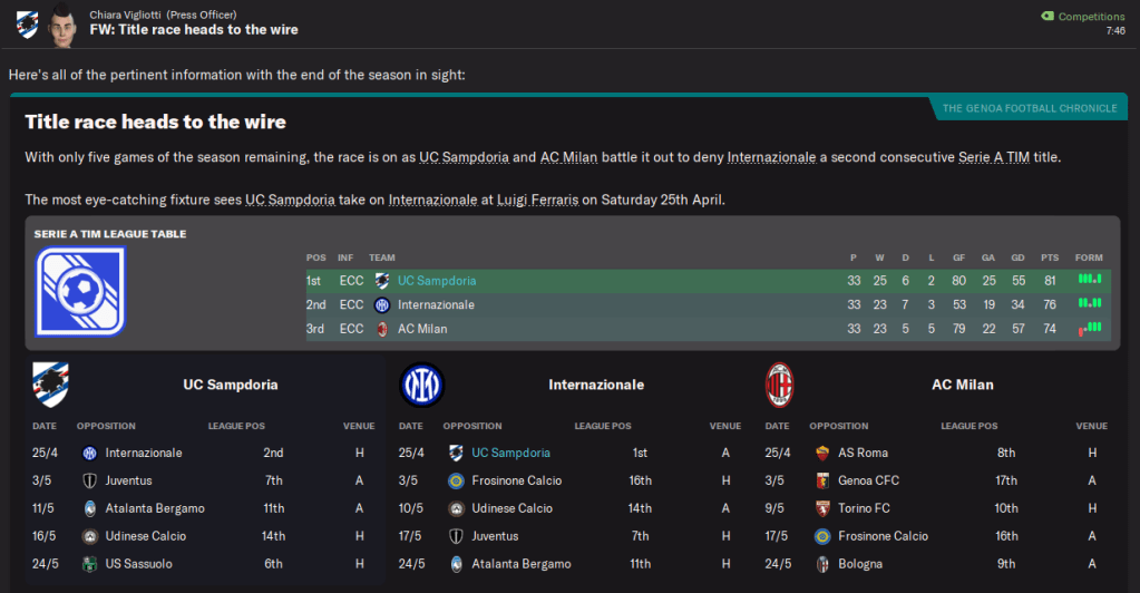 With five games to go, Samp still enjoyed a five-point lead over Inter and were seven clear of Milan. But their run-in was far from easy and began with an absolutely massive top-of-the-table clash.