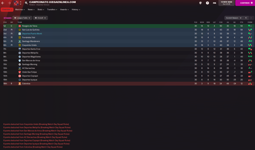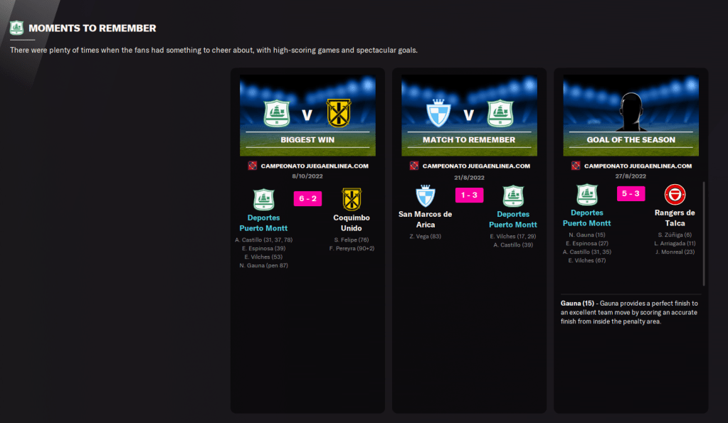 That ensured an impressive third-place finish for Puerto Montt, who finished just three points off automatic promotion! They won 15, drew six and lost nine, and finished with the best attack in the league as they scored 53 goals and conceded 39. This year, eight of the 16 teams got docked six points for failing the under 21 player usage rule.