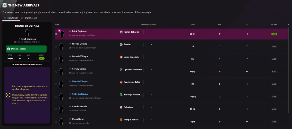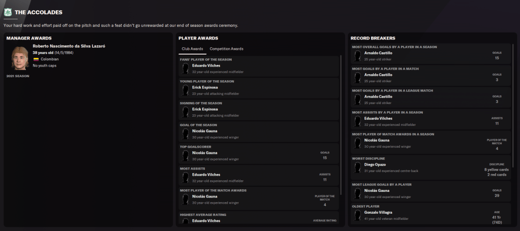 The main man this season has been Vilches, who topped the club’s assists with 11 and the best average rating of 7.3. Vilches won fans’ player of the season and Espinosa the young player of the season. Gauna and Castillo were joint-top scorers with 15 goals, followed by Vilches with an impressive 10 and Espinosa, who got nine in 21. Rojas also popped up with six goals from centre-back. Quiroz chipped in with seven assists, as did 41-year-old Villagra, who’s retiring in the summer after a strong 25th season of his playing career.
