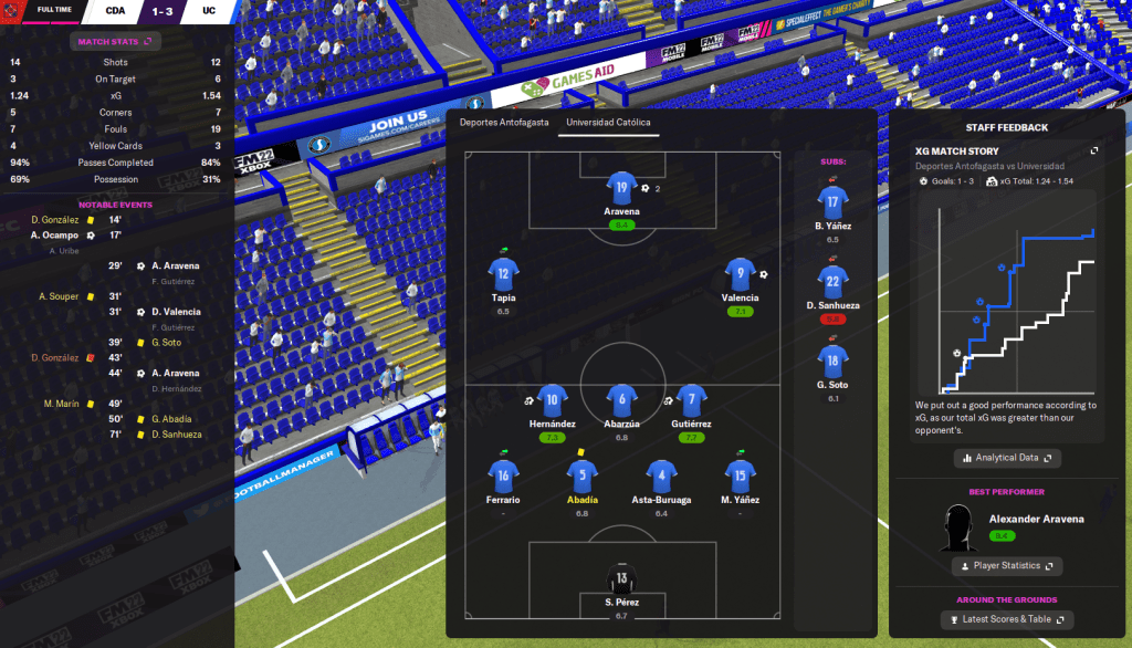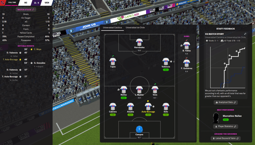 Next was a home clash with Nublense, who Lazaró still believed should not be in this league. Read the last episode to find out why! He wanted his side to batter them but was satisfied with a dominant 2-0 win thanks to a Valencia brace.
