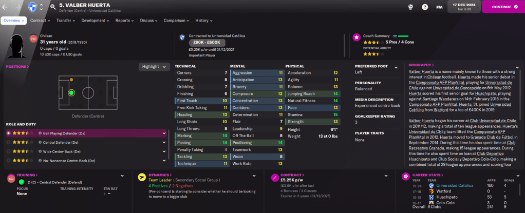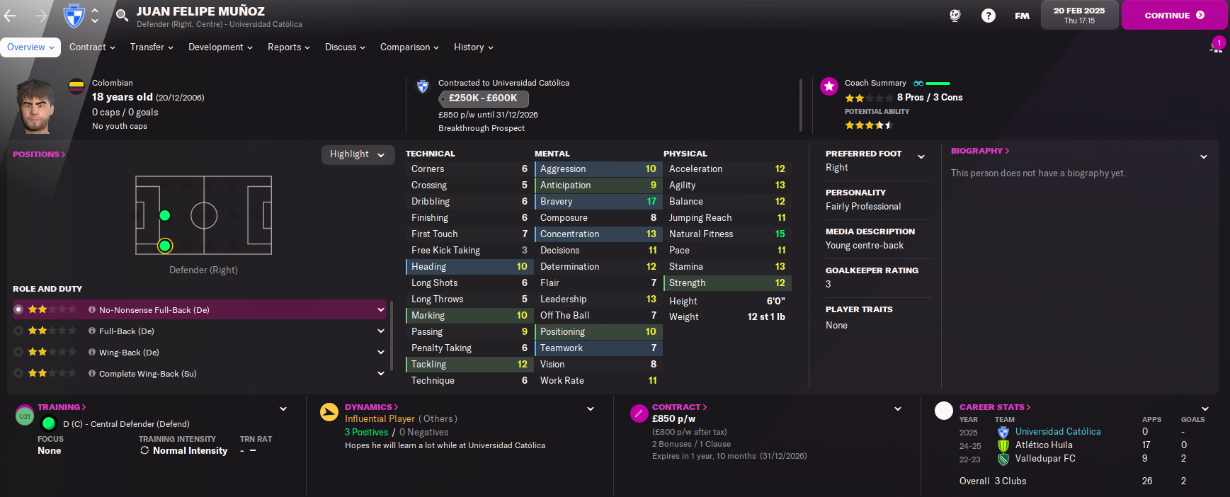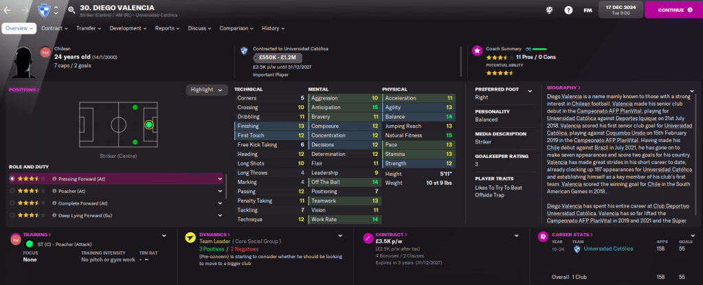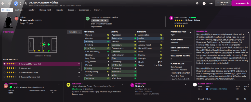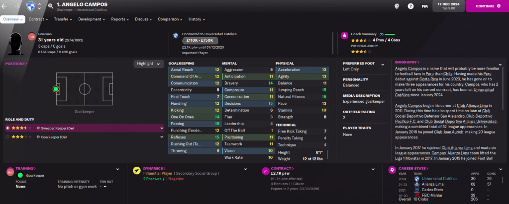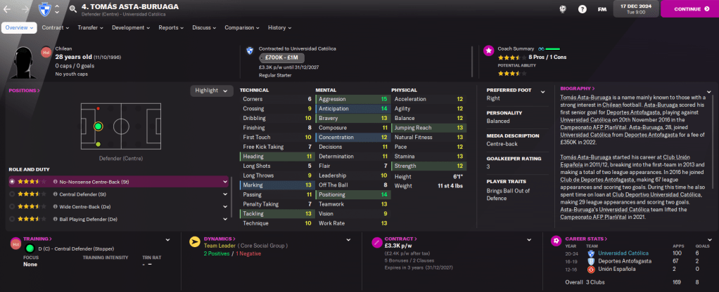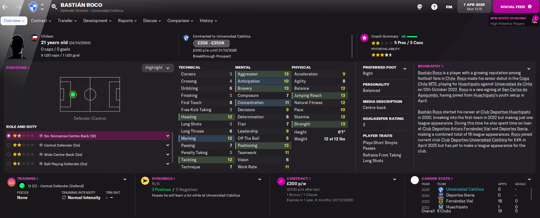 The Católica squad, unsurprisingly, offers a massive step up in class compared to what Lazaró was working with at Puerto Montt. For example, goalkeeper Miranda was the best player at his old club but was rated a 2-5-star player by his scouts.