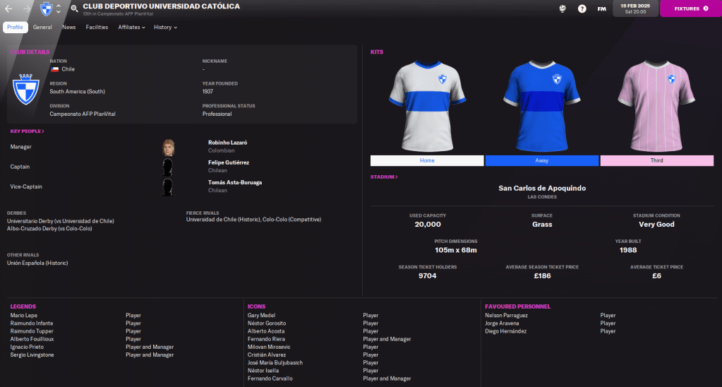 Los Cruzados has traditionally been known for being a club for the higher classes, largely due to the very pleasant neighbourhood its stadium is located in. Católica has also developed a reputation for having one of the best infrastructures in South America and producing young talents, the most famous of which is Gary Medel. In real life, it’s currently managed by Gustavo Poyet, whose son Diego is his assistant. And, by the way, Poyet recently became the manager of Chile in this save.