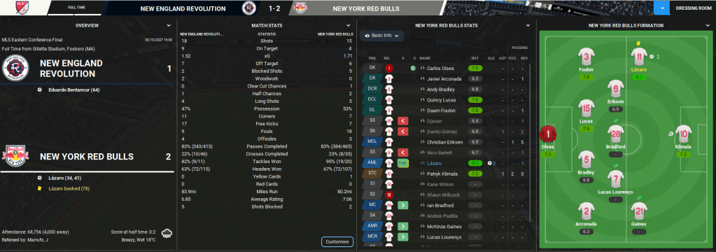 That sent them through to the Eastern Conference Final and a tough away game against Supporters’ Shield “winners” New England. Pretty unfairly, that game came just three days after the semi while New England had a totally fresh team. But NYRB brought their momentum into the game and played superbly in the first half, creating loads of chances. They eventually took one as Klimala slid Lázaro through, he rounded the keeper and tucked home. Seven minutes later, Gómez whipped in a cross and Lázaro headed home at the back post to double the tally. New England came back into it after the break and the league’s best player Eduardo Bentancur got them back into it, but NYRB defended superbly to hold them off to win the Eastern Conference and book their place in the final!