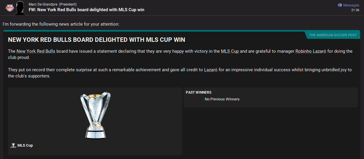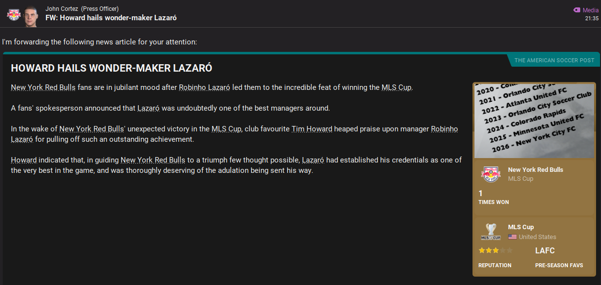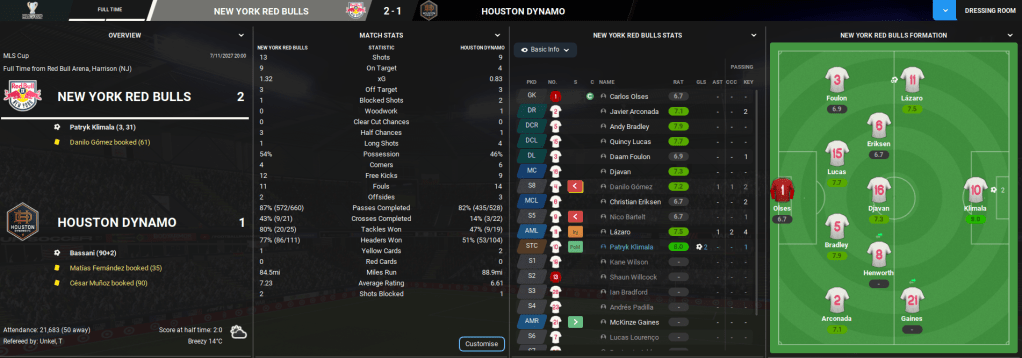 Lazaró had led NYRB to only their second-ever MLS Cup final, having previously done so back in 2008. Their opponent in the 2027 MLS Cup Final was Western Conference winners Houston Dynamo, who finished third in the conference, sixth overall and with whom NYRB drew their only meeting this season 0-0 back in June. Houston does have history in the tournament, winning it in 2006 and 2007 and reaching the final in 2011 and 2012.