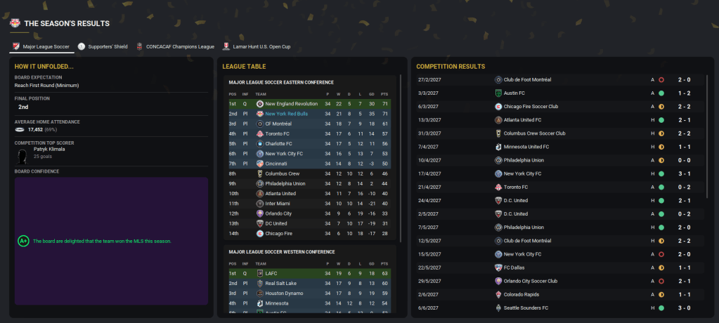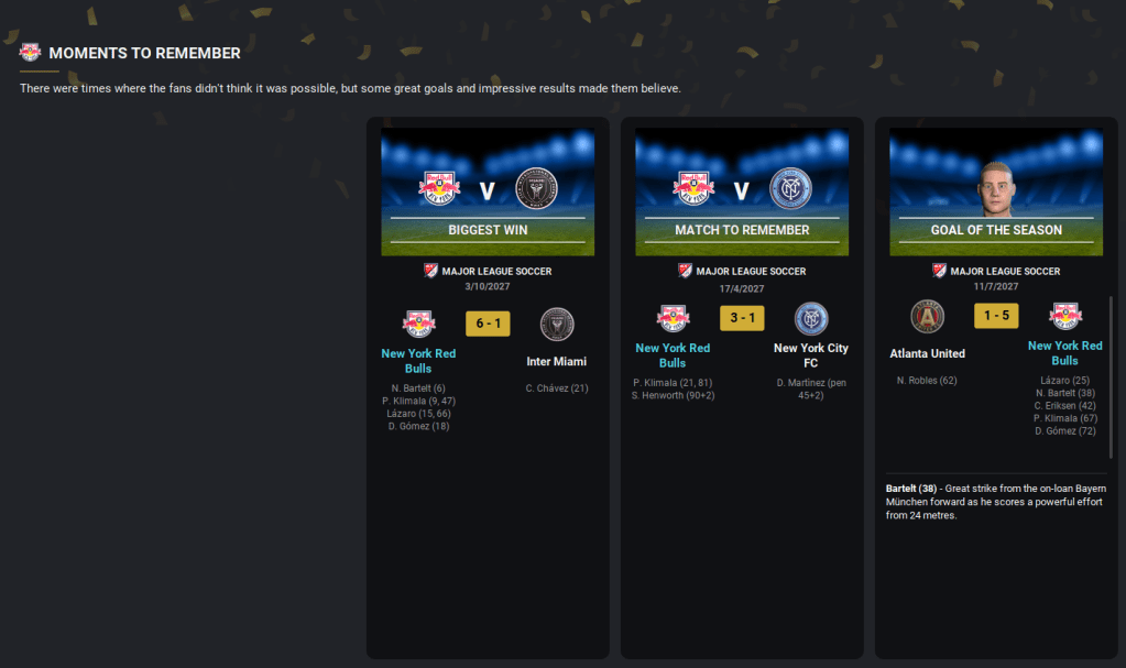 Bizarrely, the season concluded with two games against Inter Miami. First was a trip to Miami and a great start as Bartelt scored inside four minutes. Eriksen volleyed home a second and Klimala wrapped up a 3-1 win to temporarily take NYRB joint-top. New England played later that day and lost 4-1 in Charlotte but stayed top. More of the same followed at home as Bartelt, Klimala’s 20th of the season, Lázaro and Gómez put them four-up inside 18 minutes. Klimala and Lázaro scored again after the break to seal a 6-1 thumping to finish the season in style.