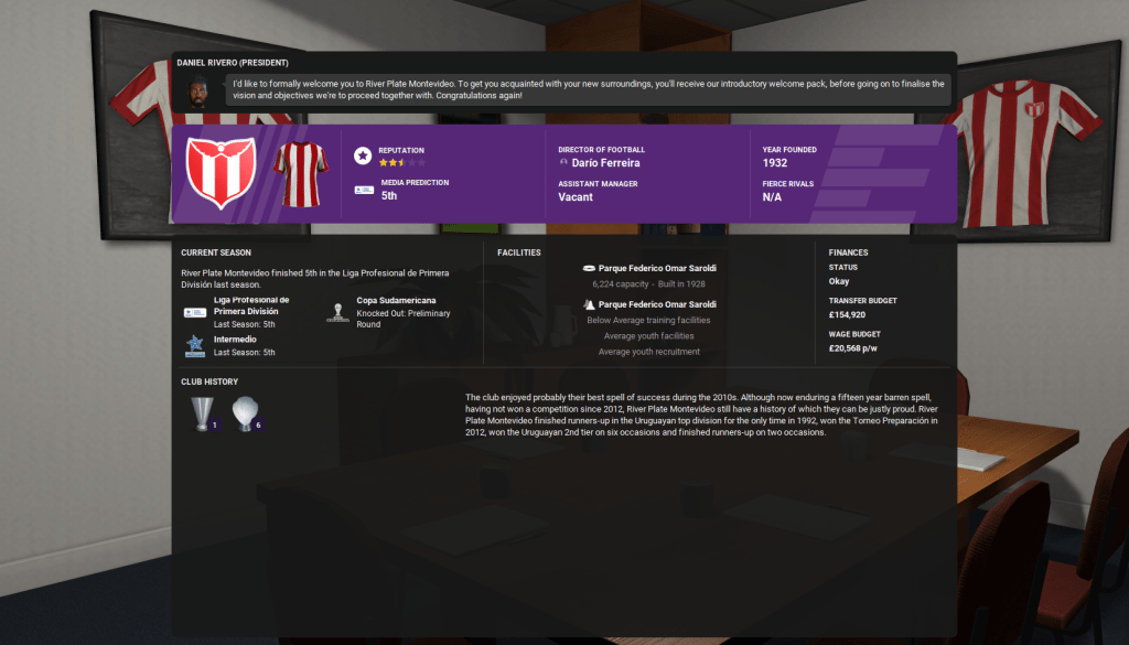 River Plate was founded on 11 May 1932 as a merger of two former clubs Olimpia and Capurro. The club’s managers established Olimpia Park as a home stadium, which was renamed Estadio Saroldi in honour of their first-ever goalkeeper, who died from an injury suffered during a match. The club still plays at the 6,224-capacity stadium, which FM believes is called Parque Federico Omar Saroldi, and has below-average training facilities, average youth training facilities and youth recruitment, and good academy coaching.