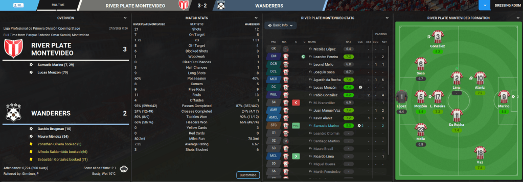 The first game of the Lazaró era took them to CA Rentistas. River Plate had the better of a poor first half and eventually got themselves in front through a free-kick by wing-back Pablo González. The hosts levelled with a very harsh last-minute penalty, only for debutant midfielder Martín Fernández, who joined on a free from rivals Wanderers at the end of last season, to score a 97th-minute winner off the bench!