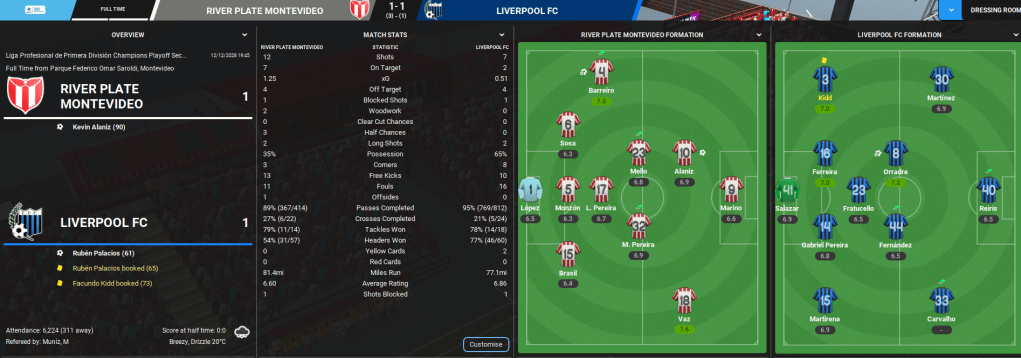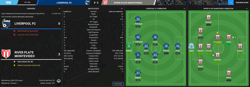 Lazaró presumed their season was done but River Plate bizarrely got a second chance. Nacional progressed to play Liverpool FC and lost 1-0. And that set up a two-legged Final – which this time was actually a Final! – with Liverpool FC, who they’d beaten in all three meetings this season.