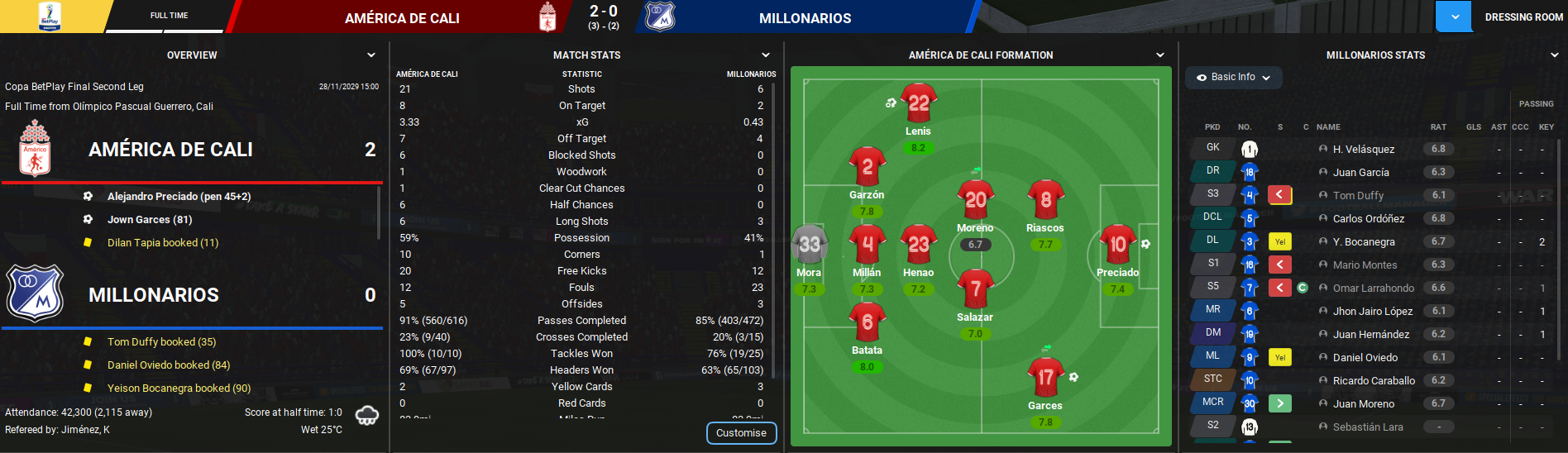 In addition to their strong league showing, América also made it to the Colombian Cup Final, defeating city rivals Deportivo 4-1 in the two-legged semi-final. The Final, also over two legs (obviously) was against rivals Millonarios, who overcame Nacional in the semis.