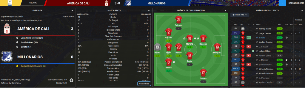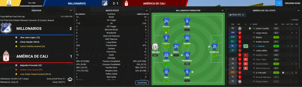 The away leg – which was América’s 74th game of the season – was up first and started well as Preciado tucked home from a corner thanks to some shocking marking. But with the team absolutely exhausted and being reduced to 10 men with an injury, Millonarios came back into it and won 2-1. A fresher squad was much improved in the home leg and made the breakthrough with a Preciado penalty. They dominated even more after the break and finally got their reward as young winger Jown Garces came off the bench to head home a late winner, after a mere 3.33 xG to 0.43.