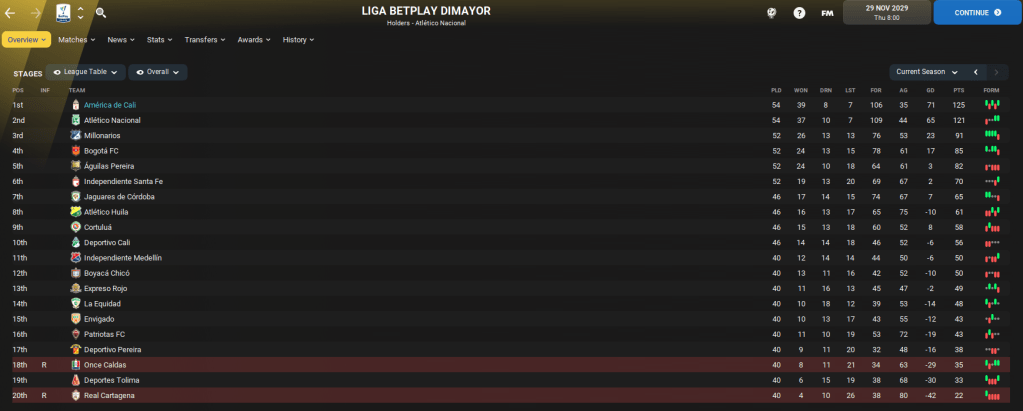 As a result, despite winning the overall league table for the season with an impressive 125 points from 54 matches, América missed out on the end-of-season Final. Millonarios went on to win it on penalties against Nacional after drawing 2-2 over two legs.