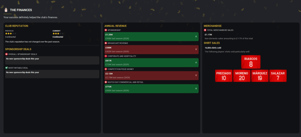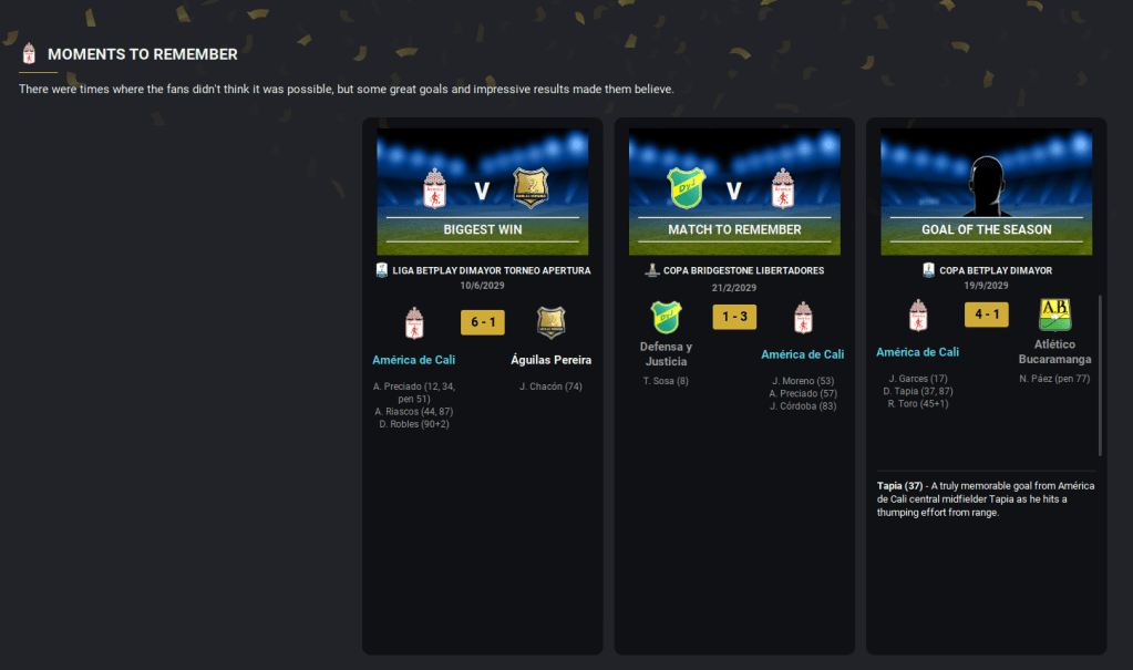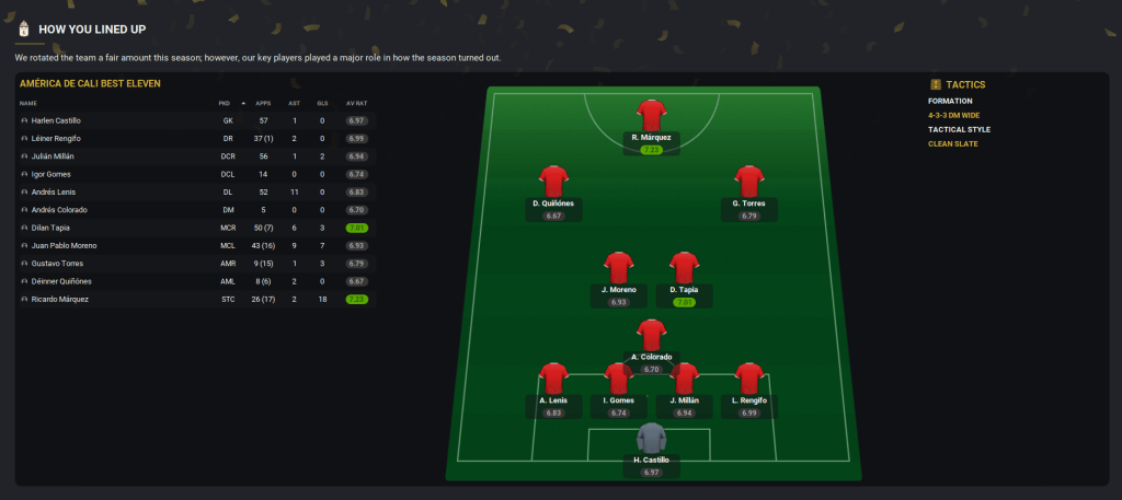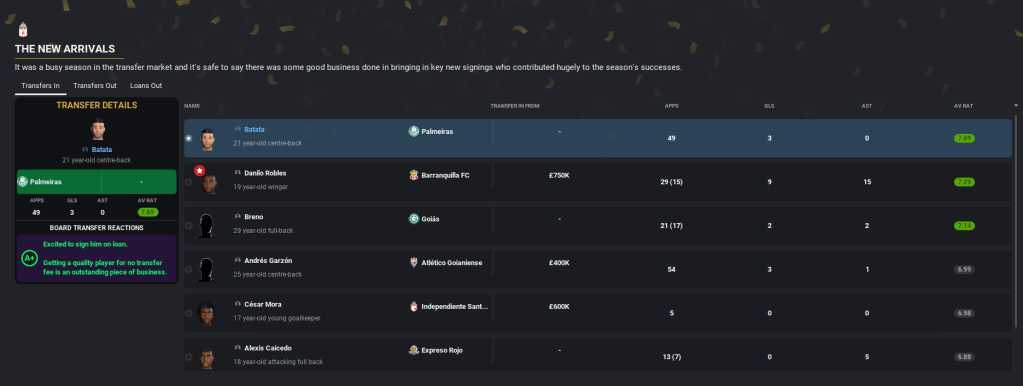 The league’s star man was on-loan defender Batata, who set two stunning league records with an average rating of 7.74 from 37 matches and 14 player of the match performances, which was five more than anyone else! As a result, he won First Division Player of the Year, with Robles third, and Young Player of the Year, with Robles second. Preciado was the league’s second-top scorer with 28 goals and Robles had the most assists with 15. And Batata, midfielder Juan Felipe Salazar and Preciado made the team’s league of the year.