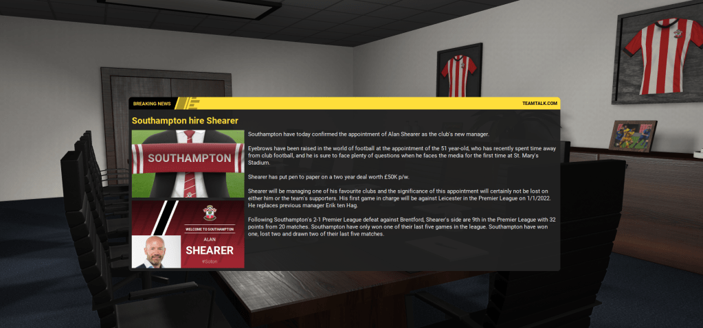 This new FM Experiment allows us to recycle an existing manager profile. Geordie hero Alan Shearer now tries his luck as the new manager of another former club, moneybags Southampton. If you didn’t read the Newcastle experiment, then we’re basically acting as a Director of Football in charge of all transfer activity. We’ll either holiday through matches, if we have a half decent assistant manager, or use the ‘Instant Result’ option to ensure our tactics are being utilised.