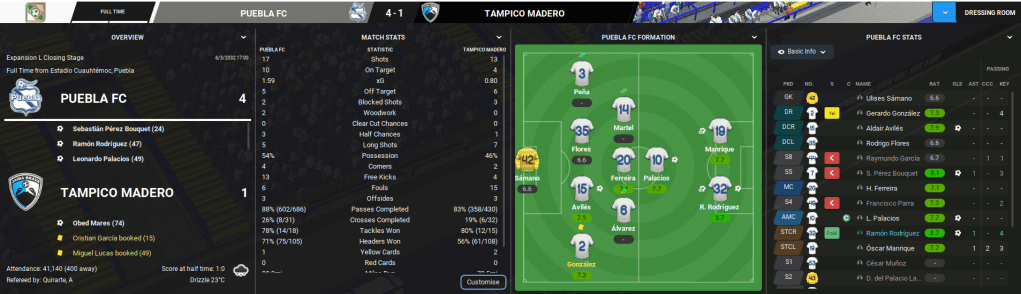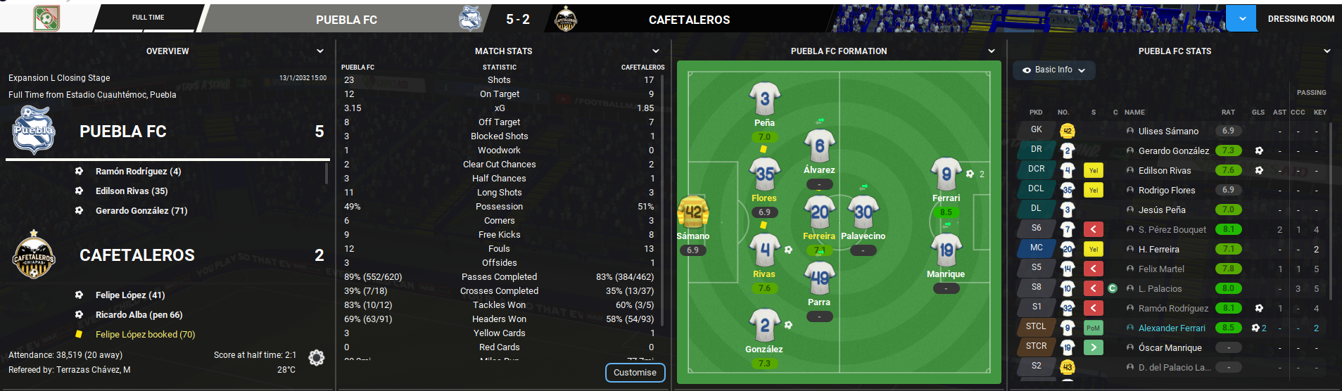 They recovered well from that with four straight wins, including a Ferrari hat-trick in a 3-1 win at Alebrijes de Oaxaca that took him to 20 goals for the season (including the opening stage). However, he then got injured and without him Puebla looked goal-shy in a 1-0 loss at Zitácuaro. They fired back to race into a 3-0 lead at Correcaminos UAT, with Ferreira getting his first goal for the club, before the dodgy defence and goalkeeper let in two more goals. But that was followed by a dominant 4-1 win at home to Tampico Madero.