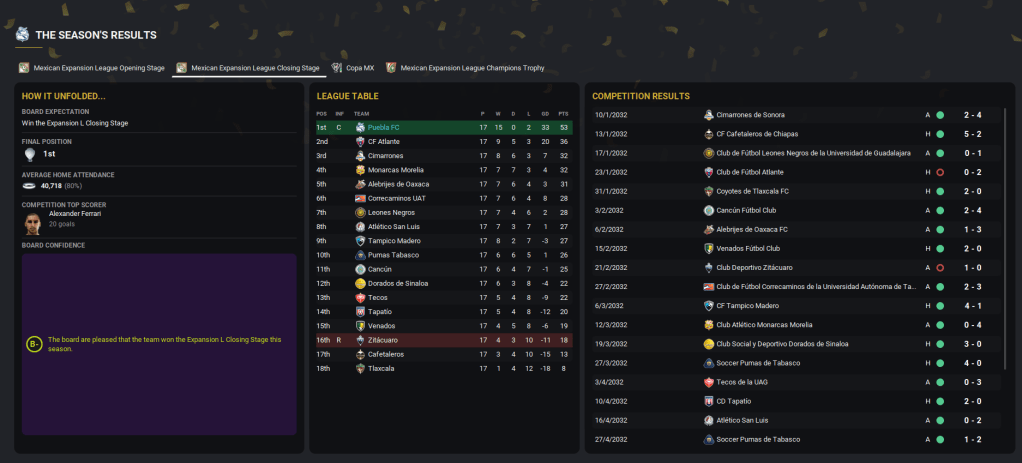 The final saw Puebla take on Cimarrones, with the away leg again up first. They made a flying start as centre-back Aldair Áviles headed home the opener only for the hosts to swiftly equalise. And the poor defnece again showed up to lose a relatively tight game 2-1. Lazaró laid into los chicos to fire them up for the second leg and it worked as they again started well with Ferrari bagging a brace inside 32 minutes. The star striker wrapped up his hat-trick after the break to seal a 4-1 win that wrapped up the Mexican Expansion League Closing Stage!