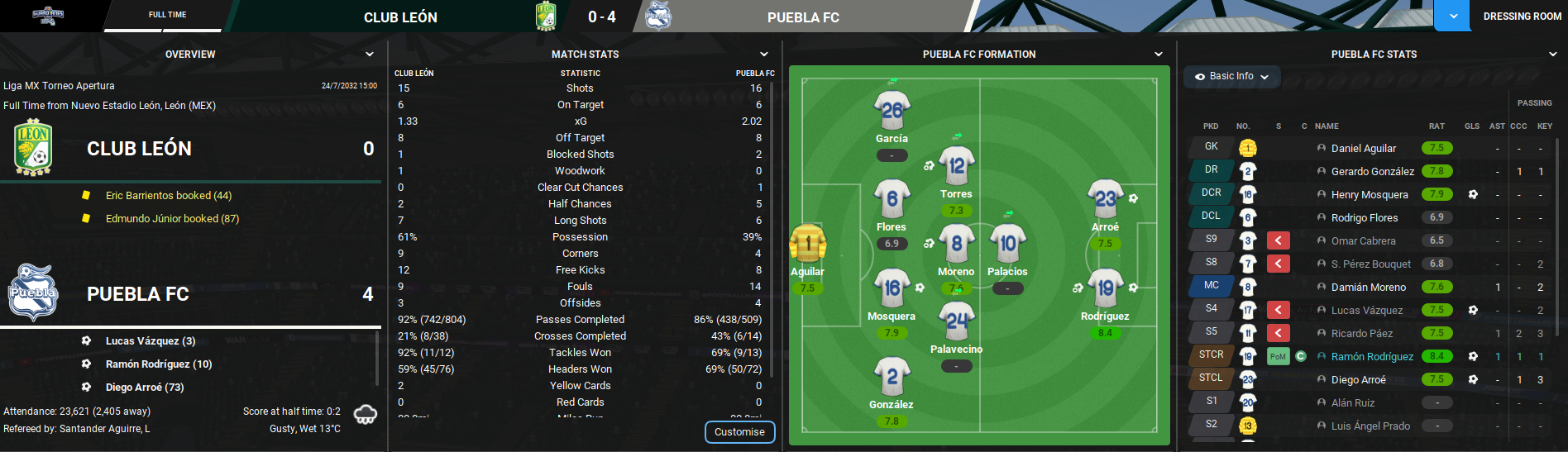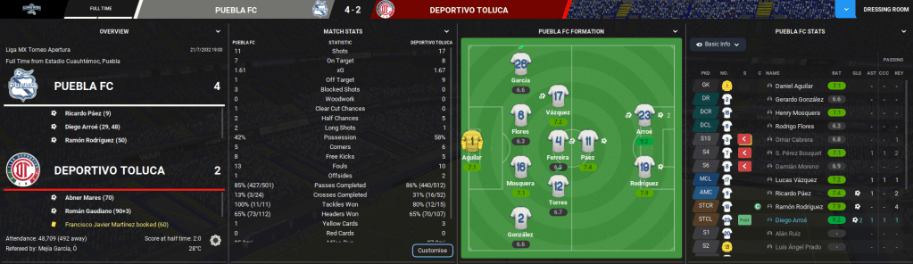 The reward was a two-legged quarter-final with league winners Pachuca. Puebla were at home first and again racked up more xG but lost 3-2 due to poor defensive performances. Pachuca then obviously scored with their first shot in the second leg and swiftly added a second and hit the bar twice. Puebla responded well to get back to 2-2 through midfielder Nicolás Palavecino and Rodríguez but idiotic right-back González got himself sent off for a two-footed tackle on a player by the corner flag to kill any chances of a fightback. And they exited 5-4 on aggregate.