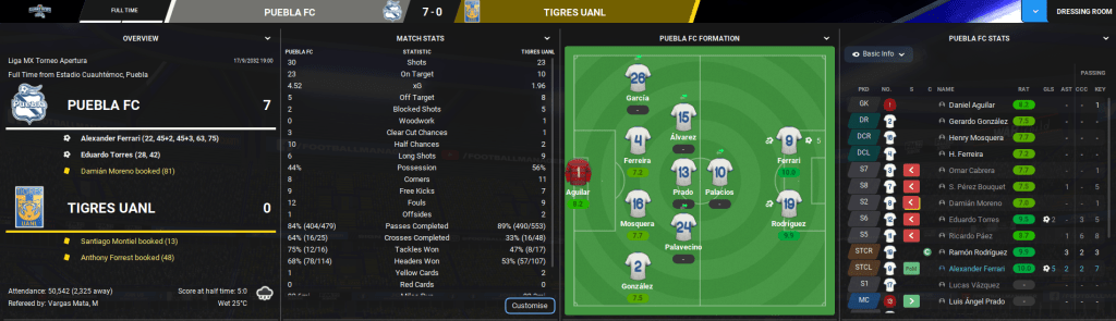 As if the run of form wasn’t bad enough, they then had to face Tigres and Monterrey. However, out of nowhere, they ran riot in the first half at home to a struggling Tigres as a Ferrari hat-trick and a brace from midfielder Eduardo Torres had them 5-0 up at the break! Tigres made mass changes but it didn’t affect the flow of the game as Ferrari bagged two more to wrap up a Liga MX record five-goal haul and a massive 7-0 win with 5.52 xG!