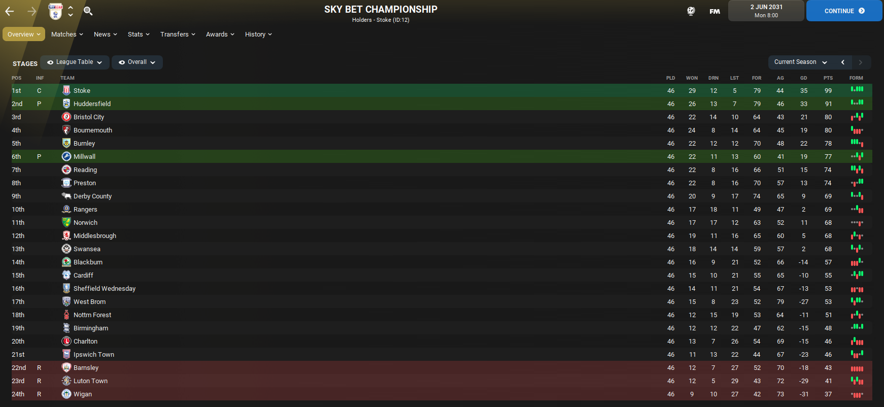 But what’s happened to Rangers? They finished down in 9th in their first season back in the Championship, dropped to 18th in 2029 then finished just outside the playoffs in 7th in 2030. The season just gone saw them drop to 10th and Championship mediocrity, despite being predicted 3rd. They’re now managed by former Liverpool and Lazio manager Luis Alberto, who took charge in March after Fonseca left in December 2027 and was replaced by Scott Carson then Imanol Alguacil.
