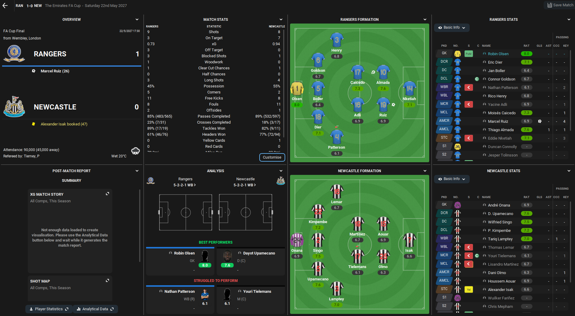 Celtic finished 7th in the top tier on 59 points, which is their best finish yet. They finished 14th in 2028, 11th in 2029 and 13th in 2030, so this represents a massive step up. However, they didn’t qualify for Europe due to 8th and 9th place Leicester and Leeds winning the domestic cups. Their best player remains Ramos, who scored 22 in 44, along with Gelhardt, who scored 22 in 48 and now has 2 England caps, Bogusz, who averaged 7.21 and Cole Palmer, who got a club-high 13 assists. They also have a couple of regens who look like exciting prospects. Celtic are still managed by Larsson and, interestingly, have won several Premier League youth divisions in the last few seasons.