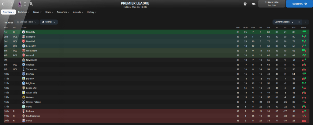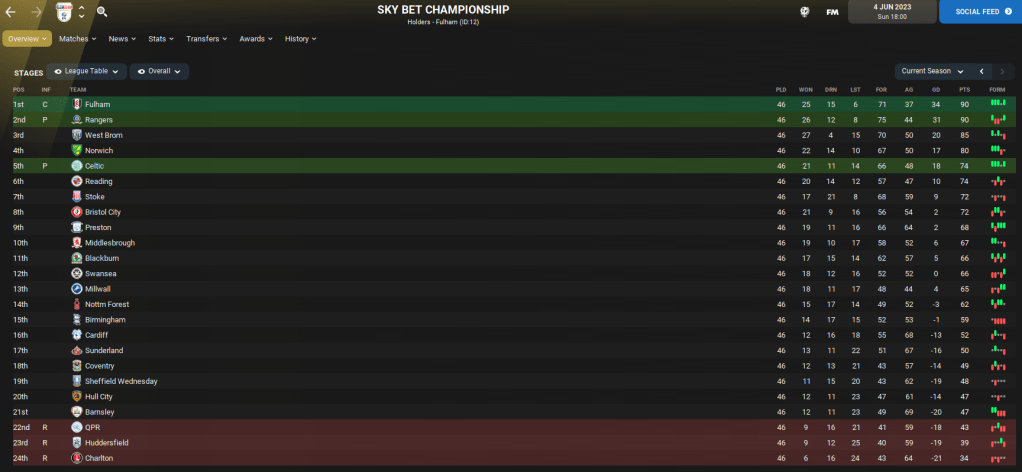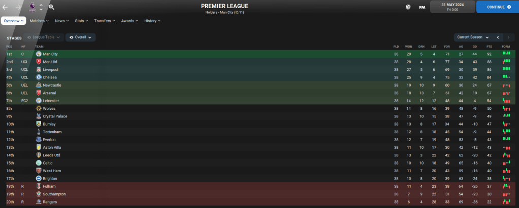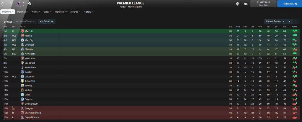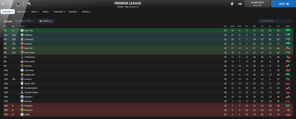 So there you have it. If Celtic and Rangers came to play in the Premier League, FM22 thinks Celtic would do pretty well and push for European football, while Rangers would become a mid-table Championship side! Of course, if this was to happen in real life then both clubs would have more money than they actually start the save with. But I think this was a fun experiment to see how they fared.