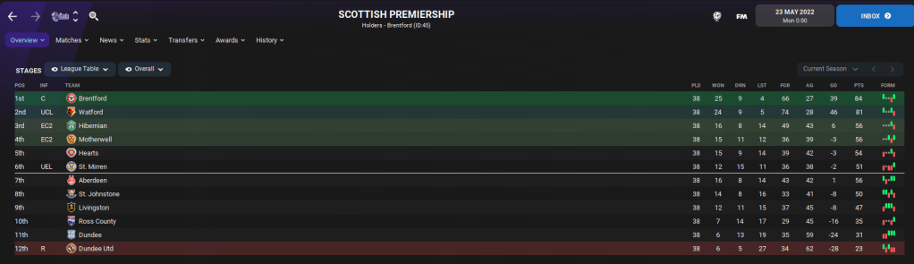 While relegation was confirmed for the Old Firm, how did their replacements fare? Well, Brentford won the Scottish Premiership by 3 points from Watford, who finished 15 clear of Hibs. Ivan Toney was the top scorer with 19 goals and Moussa Sissoko was the best player in Scotland with a 7.48 average rating.