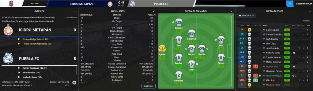 Lazaró’s bid to win the Champions League began in the second round against El Salvador side Isidro Metapán. Puebla started the first leg terribly, giving away a penalty after eight minutes. But they eventually responded through Rodríguez and Gutiérrez’s first for the club. But Lazaró was unhappy with the wasted chances in a 2-1 win. The second leg was much more comfortable as a Rodríguez brace, a Páez header and Garza and García’s first goals for the club earned a 5-0 win.