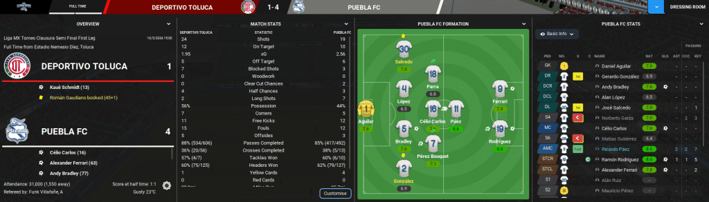The semis saw Puebla take on Monterrey, against whom they’d won one of five during Lazaró’s reign, and only one in 21 meetings through this entire save! The away leg was up first and that trend continued as they got battered by 26 shots to nine but only lost 2-0. They were much improved in the second leg and Ferrari gave them a deserved lead after 52 minutes. But yet again, missed chances came back to haunt them and they exited 2-1 on aggregate.