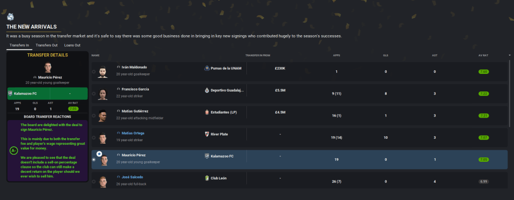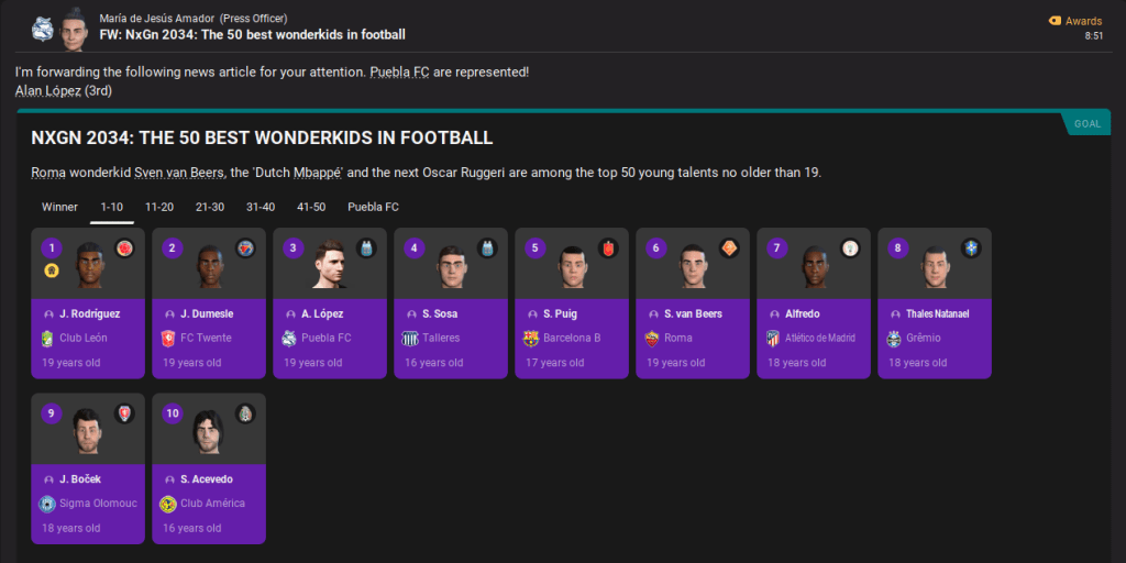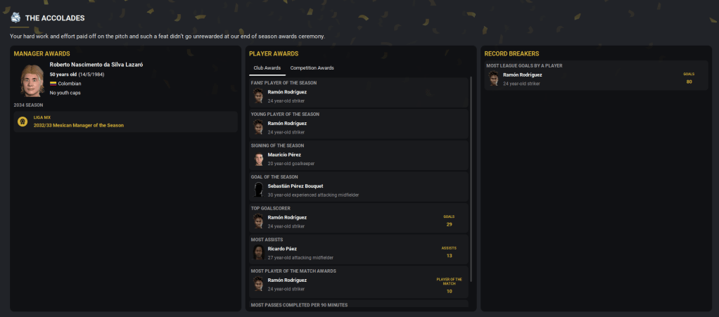 The end of 2033 saw 21-year-old, still uncapped Daniel Aguilar come second in the North American Goalkeeper of the Year, only behind Porto and Mexico number one Alexis Montano. Speaking of awards, defender Alan López came third in the NxGn 2034 award, which is the first time one of Lazaró’s players has made the list!