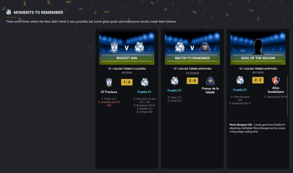 The star man this season was Rodríguez, who scored 29 and got nine assists in 44 games at a 7.59 average rating. That saw the homegrown player become the record league scorer in Puebla history with 80 goals, while he was also named fans’ player and young player of the season. He also earned his first call-up to the Mexico national team for the 2034 World Cup! Ferrari bagged 18 in 35 in an injury-hit season and Páez scored 14 and got 13 assists in 44 games, while new signings García and Gutiérrez largely impressed.