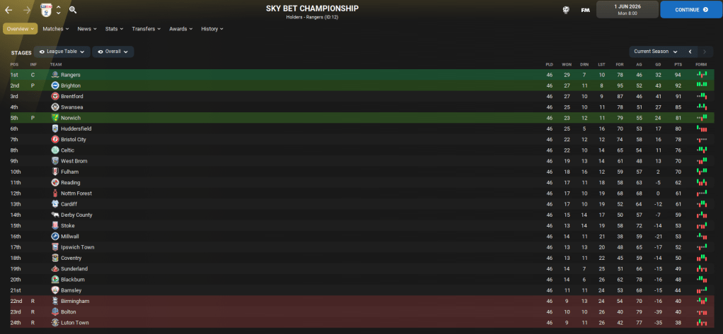 Celtic gained promotion back to the Premier League at the first attempt in 2029/30, finishing 2nd just 1 point behind champions Burnley. Rangers finished 6th but missed out in the playoffs to Brentford. And that began a familiar story for Rangers, who went to finish 3rd in the Championship 4 years in a row, but missed out in the playoffs in every single season! They then finished 6th in 2034/35 but, predictably, missed out to 3rd-place Burnley in the playoffs. But they finally broke their duck in 2035/36, when they finished 4th and finally managed to win the playoffs to reclaim their place in the Premier League.