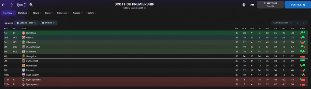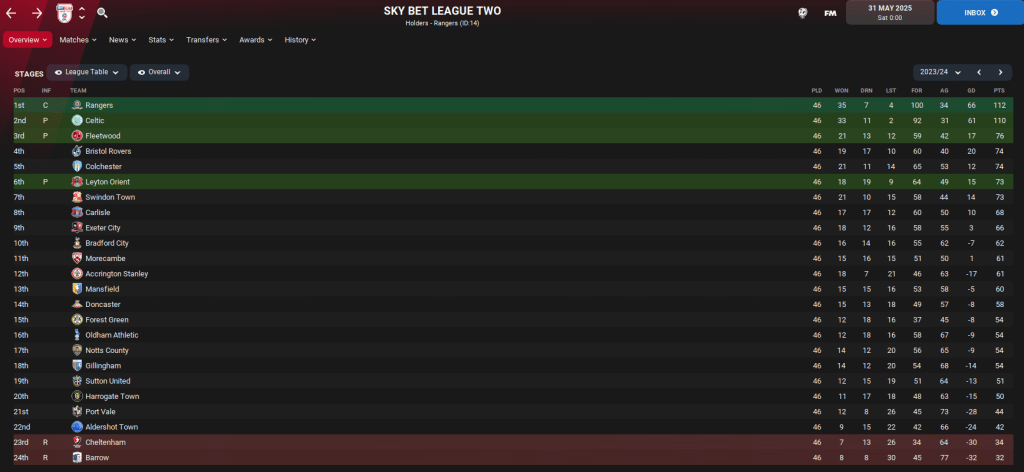 I expected the Old Firm to fly straight through to the Championship, so simmed the game ahead two more years. And my suspicions were correct with Rangers continuing to lead the way ahead of Celtic. They won League 2 with 112 points, just 2 ahead of Celtic and despite losing 4 to Celtic’s 2, then won League 1 with 103 points, a hefty 13 clear of Celtic.