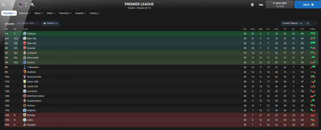But what had Celtic been up to during that time? Well, they finished 15th in their first season back in the top-tier, serving 4 points clear of relegation. They improved to 14th on 43 points and 12 clear of relegation, but then got relegated with just 16 points in 2032/33. But they bounced back as champions in 2033/34, only winning the league by 2 points from Fulham and Rangers. Celtic survived with their best points total yet, as 45 points saw them finish 15 clear of relegation in 2034/35, before improving again up to 11th on 51 points in 2035/36.