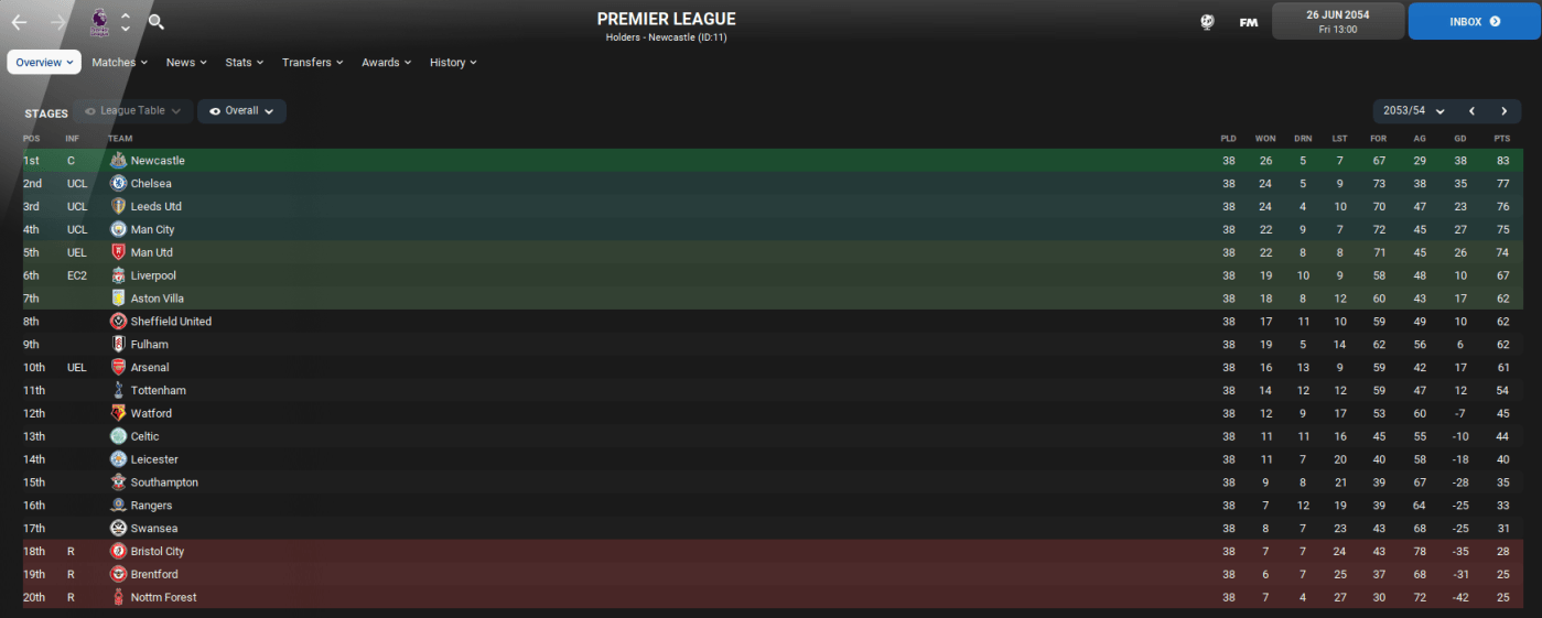 In terms of the Premier League itself, Chelsea and Man City dominated with occasional Man UFC wins. However, Newcastle got their first-ever Premier League win in 2049/50 then a second in 2053/54 and have some ludicrously good newgen Brazilians and Colombians in their team.