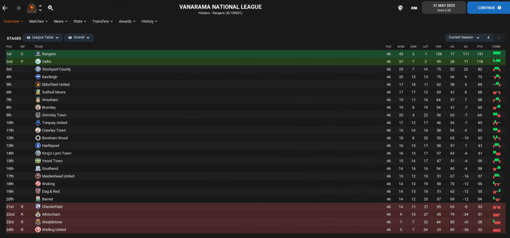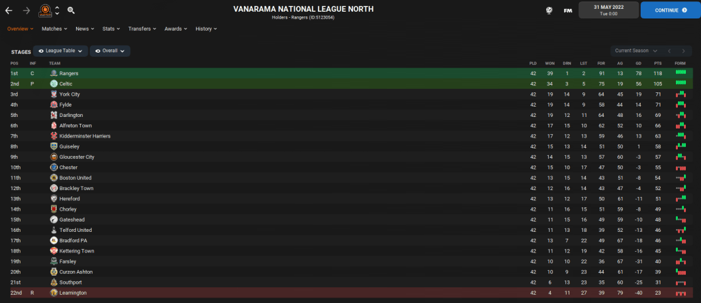We moved the two Glasgow sides into the Vanarama North, replacing the two most northern clubs in the current English pyramid Blyth Spartans and Spennymoor – who get to enjoy life in the Scottish Premiership. We fired the game up and simmed ahead to the end of the first season.