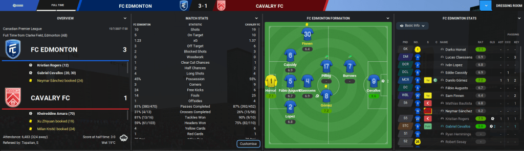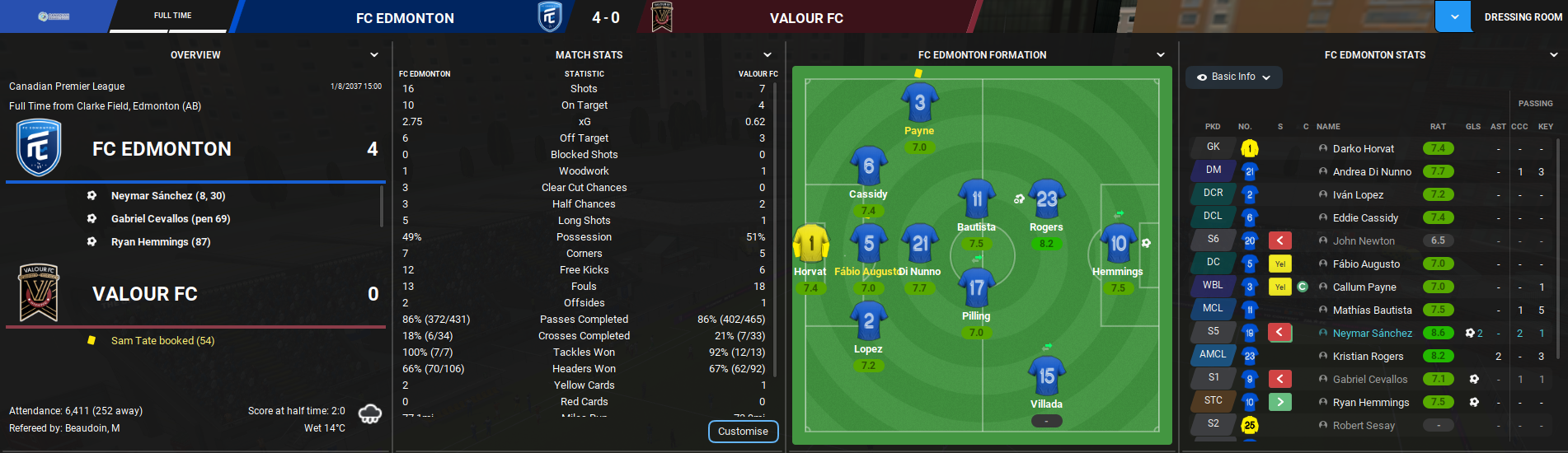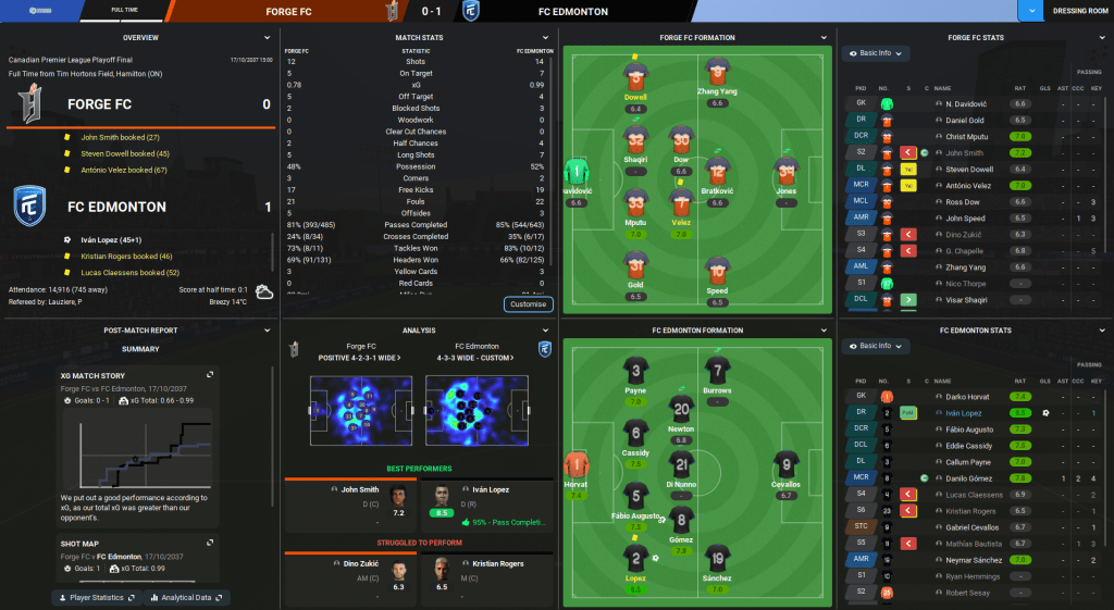 Their opponents in the final were Forge, who beat Cavalry 4-2 with two late goals. However, this time they’d be making the trip to Hamilton to put their dodgy away form to the test. And Lazaró decided to bring experience back into the team, so Edmonton lined up: