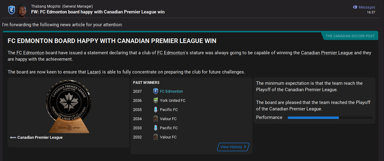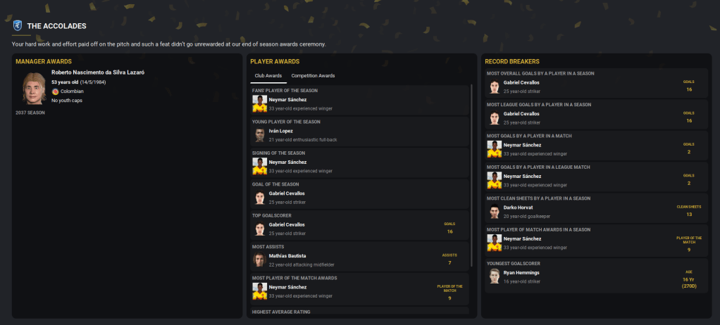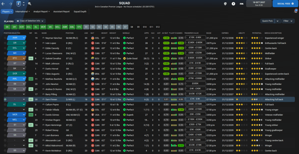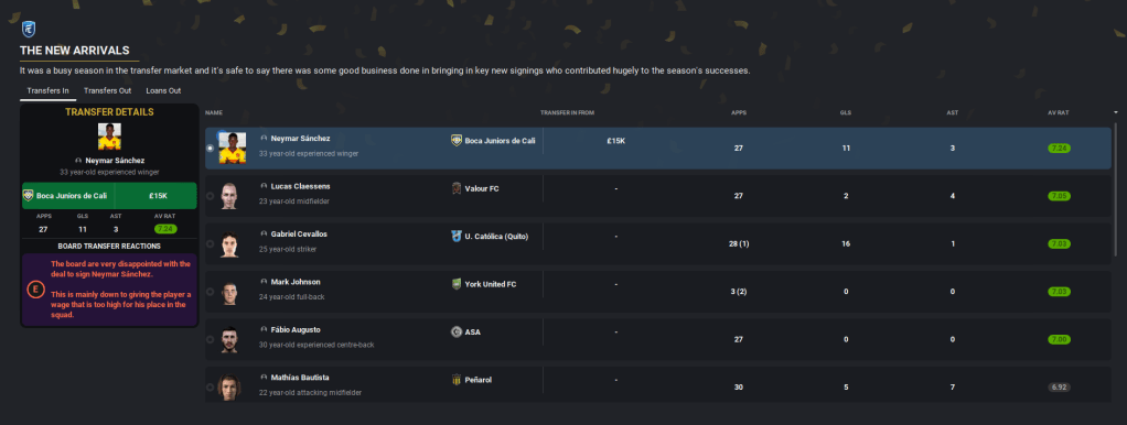 Edmonton’s best player this season was Neymar, who scored 11 and got a 7.24 average rating but his age caught up with him at the end of the campaign. And the board harshly gave the Neymar signing an E rating! Lopez was also key with a 7.11 rating and that crucial final goal, along with centre-back Eddie Cassidy and midfielder Lucas Claessens. But Cevallos was top scorer with a club-record 16 goals despite a very dodgy end to the season, yet the board gave that signing an A+!