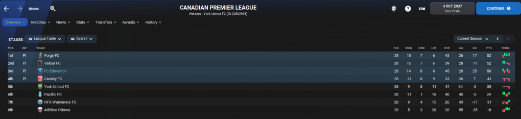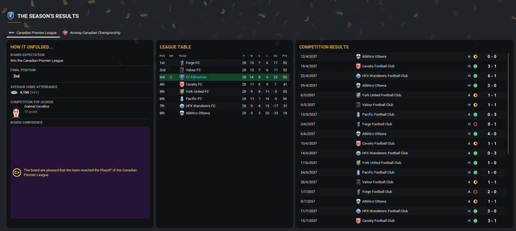 Game 5 – Forge FC (away): The final game of the league took place 25 days after that win over Pacific! Valour were top on 52 points, followed by Edmonton on 50 and Forge on 49, with Edmonton having a far superior goal difference. But their poor away form continued with an awful performance in a 2-0 defeat that saw Forge top the league table on goal difference.
