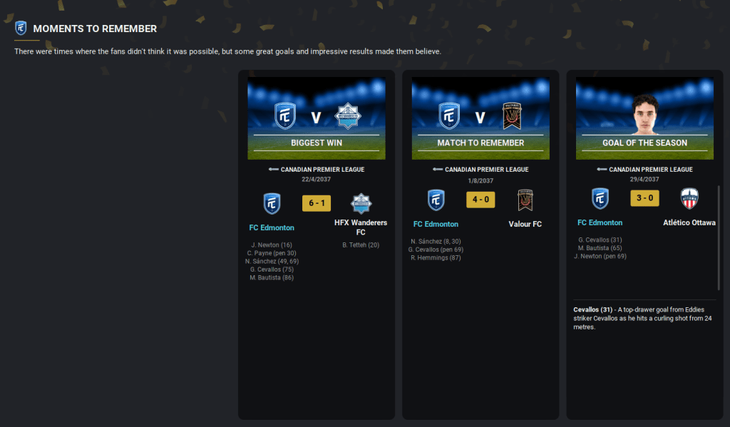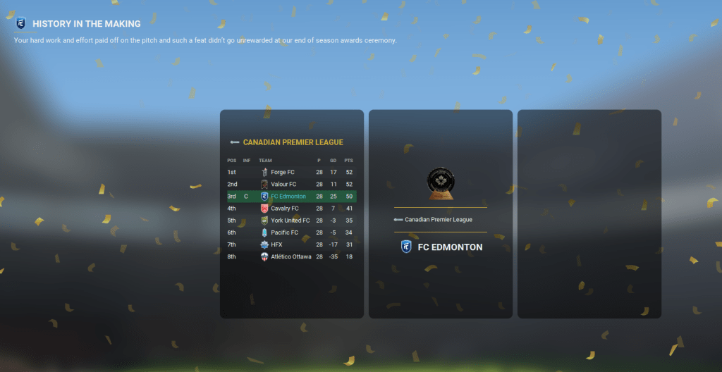 In truth, Edmonton were easily the best team in this league, having the best attack and defence in the league. And, despite a shaky end to the league campaign, that showed as it came to the business end of the season. Cevallos finished the campaign as the top scorer in the league with 16 goals in 29 games, Bautista got the joint-most assists with just seven, Neymar got the most player of the match awards with nine and Horvat kept a league-high 13 clean sheets.