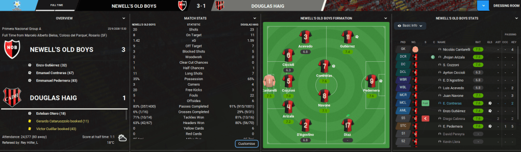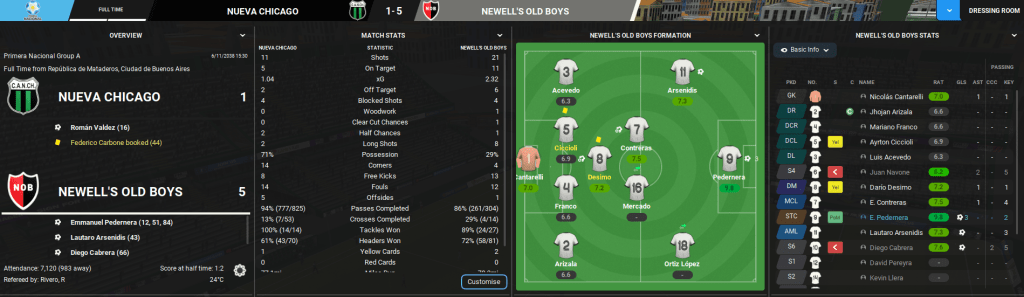 That only ramped up the pressure heading to bottom of the league Nueva Chicago. And yet another tactical tweak saw Lazaró go to a more solid-looking 4-3-3, with 17-year-old defender Mariano Franco making his debut. And it worked as Newell’s dominated and won 5-1 led by a brilliant Pedernera hat-trick.