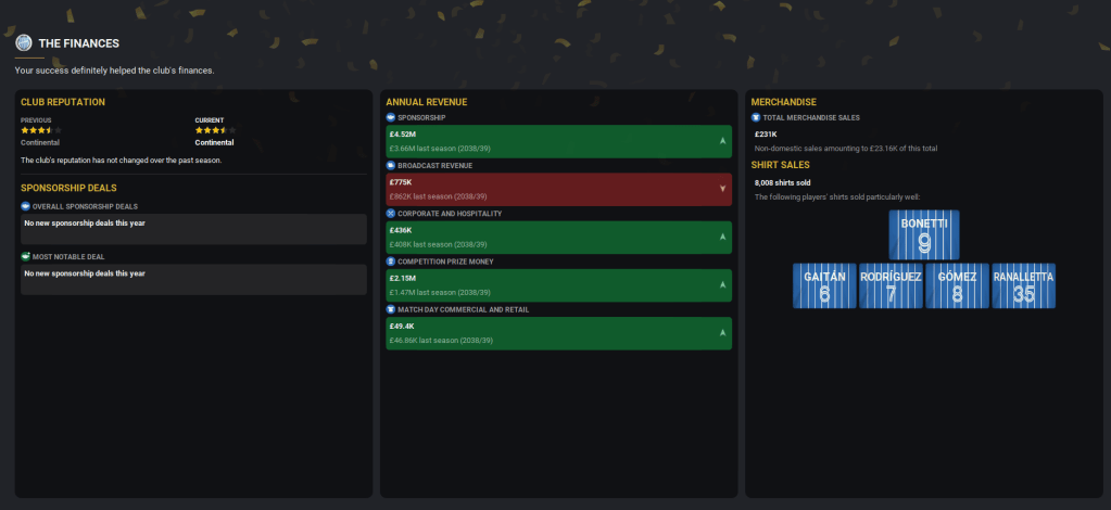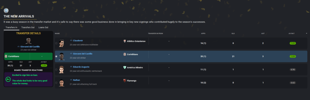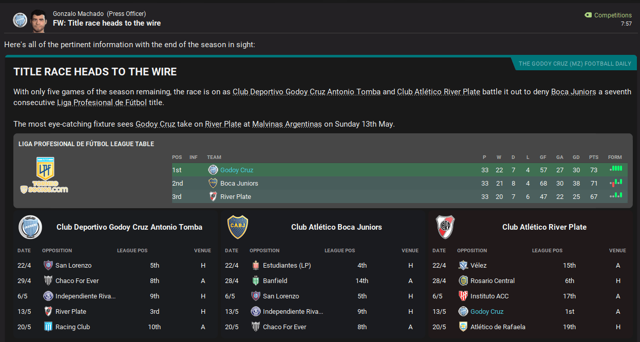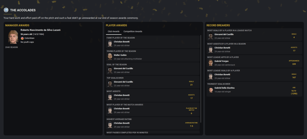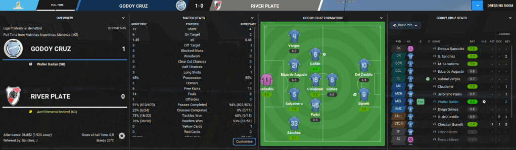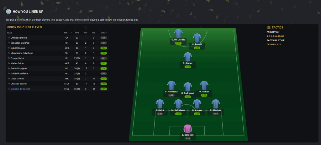 Godoy won the title by two points from Boca, with both sides only losing four times all season. They also set the third-lowest title-winning points tally since the start of this save. However, Godoy finished the campaign on an outrageous 19-game unbeaten streak! del Castillo was the third-highest scorer with 21 goals and his strike partner Christian Bonetti got the most assists (17), followed by Rodríguez’s 15, and the highest average rating (7.52). And that earned Bonetti Argentine Premier Division Best Player award.