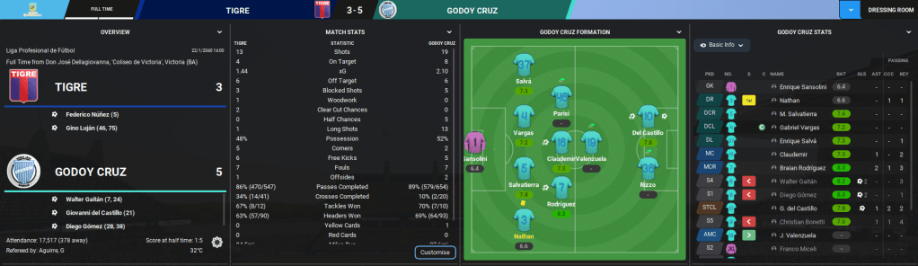 The first match after the break didn’t start well as Tigre scored their first shot. But Godoy came flying back with five goals in half an hour, including braces for midfielders Walter Gaitán and Diego Gómez, then gifted Tigre two goals back to win 5-3!