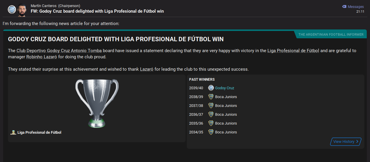 Lazaró had done it! 20 years after departing the streets of Medellín, the Colombian had not only achieved his goal of becoming a Football Manager, he’d also completed the domestic side of the Aventuras Américas challenge. He added the Argentinian title to those he’d already collected in Chile, USA, Uruguay, Colombia, Peru, México, Brazil and Canada.