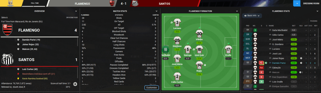 That built up to a huge game at home to leaders Santos. Flamengo again came out flying and Parisi curled home a beauty after 18 minutes. Santos then had a player sent off for an awful challenge three minutes later and the floodgates opened as Rojas and Maicon made it three inside half an hour. Santos got one back and Cabecao idiotically equalled the numbers up but Maicon doubled his tally to wrap up a thumping 4-1 victory and send Flamengo top of the league with 10 games remaining!